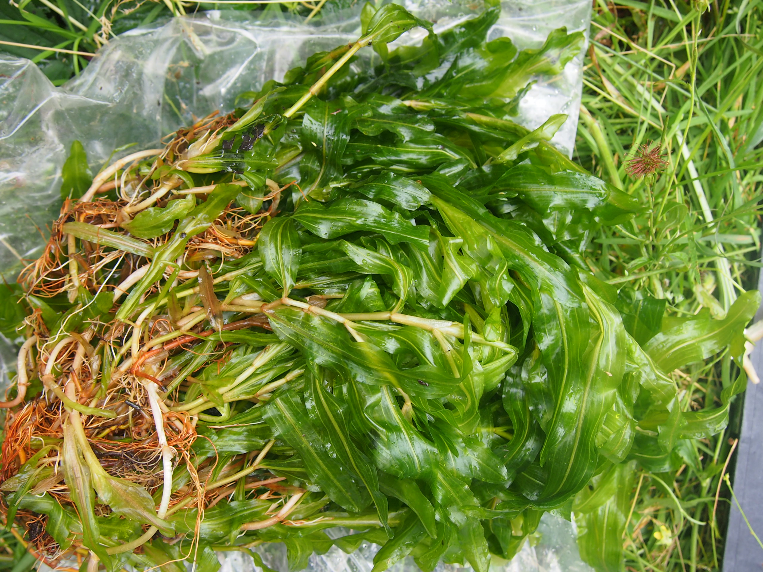 Kvetoucí přezimované rostliny rdestu dlouholistého (Potamogeton praelongus) v kleci bránící okusu kachnami.