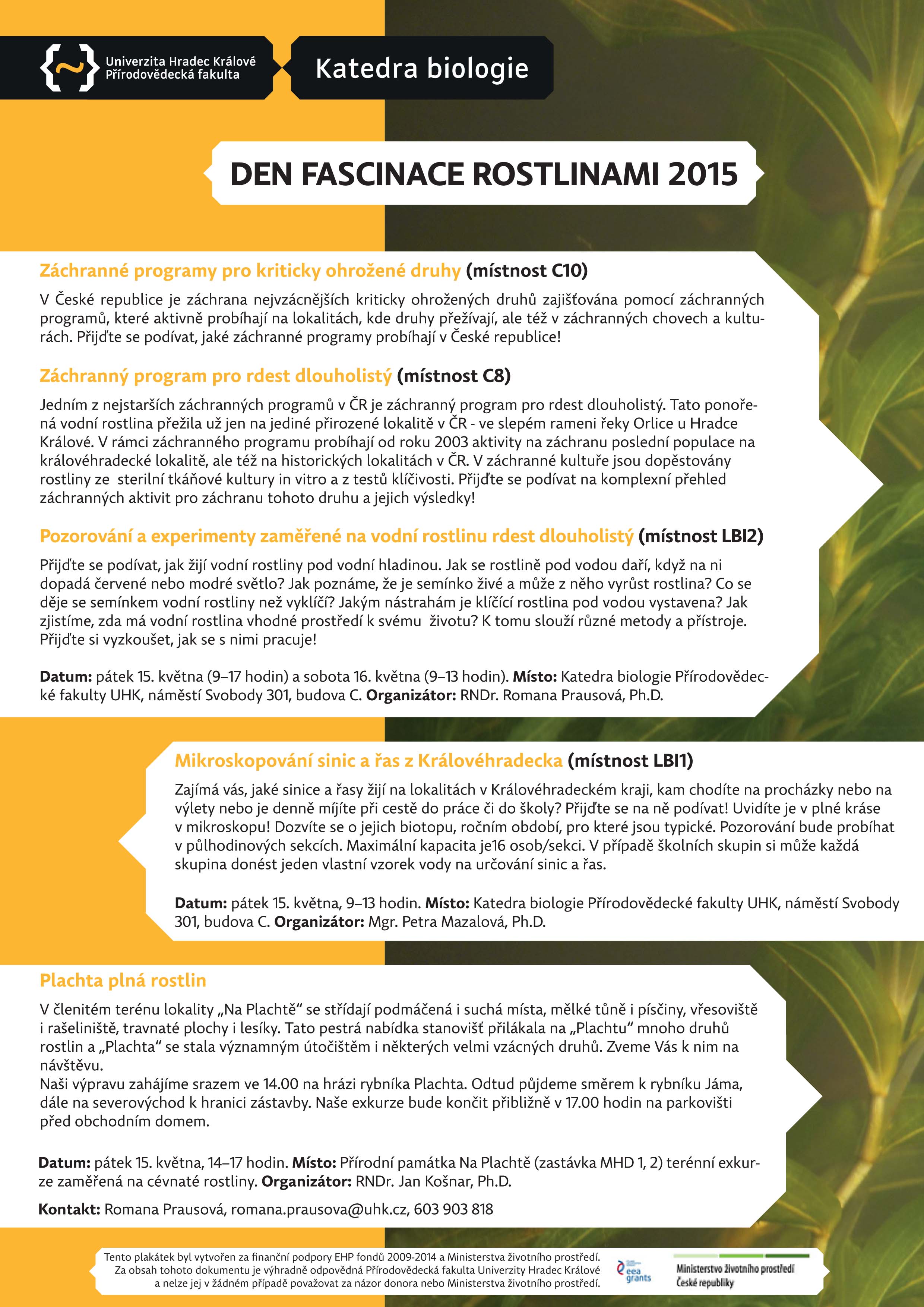 Během akce se budete moci seznámit se záchrannými programy pro kriticky ohrožené druhy, zejména pak se záchranným programem pro rdest dlouholistý (Potamogeton praelongus). Vyzkoušíte si experimenty zaměřené na vodní rostliny a mikroskopování řas a sinic. Budete se moci také zúčastnit terénní exkurze na lokalitu "Na Plachtě".